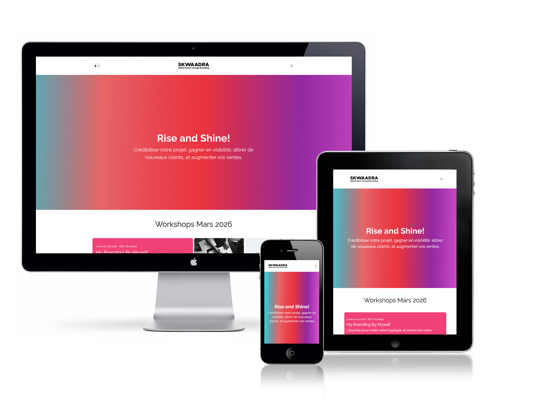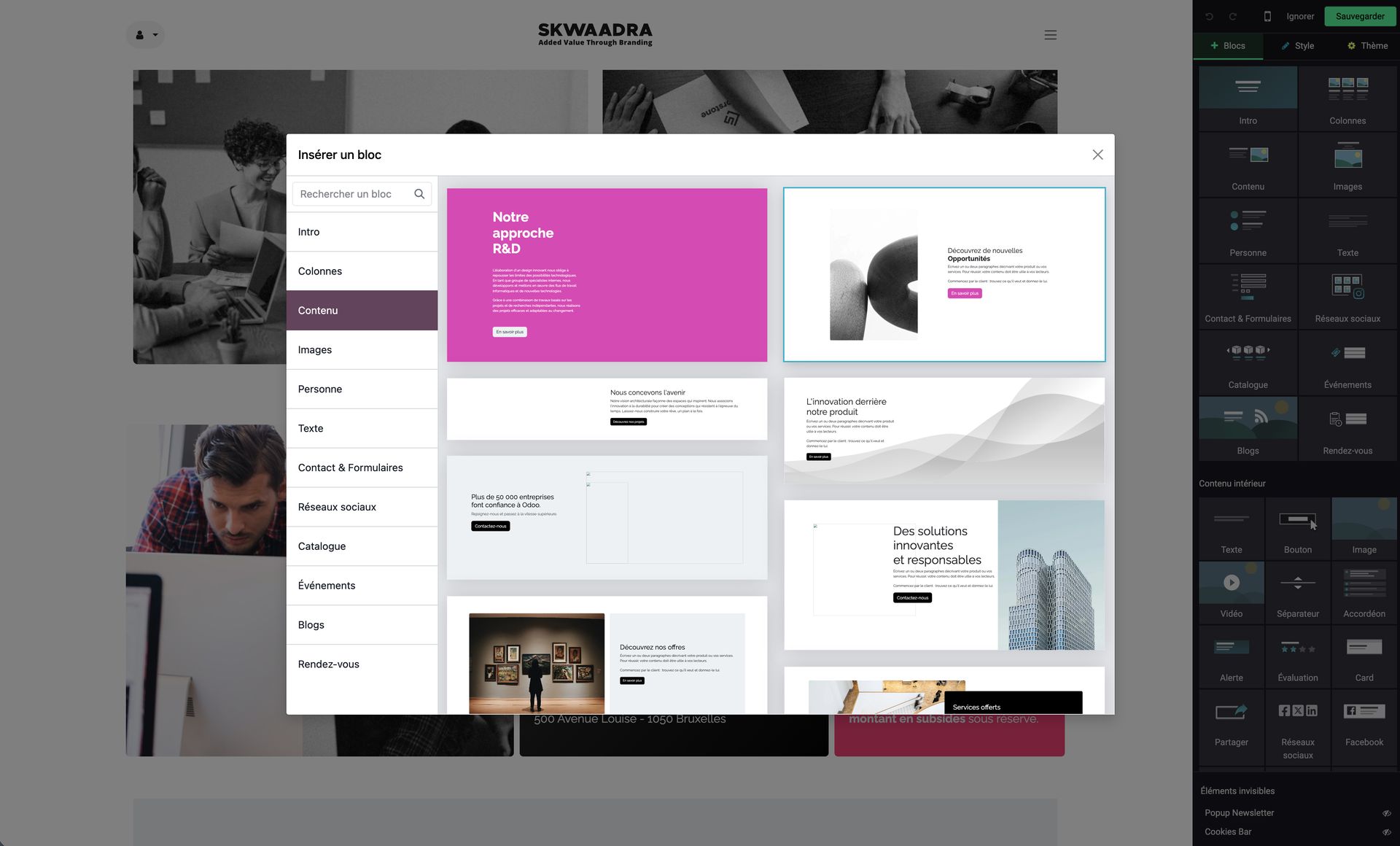 Skwaadra implémente le wireframe et tout le contenu** dans un site Odoo en y intégrant votre look & feel et votre identité visuelle. Si il faut la retravailler, on est là, et on est très bon pour ça aussi !